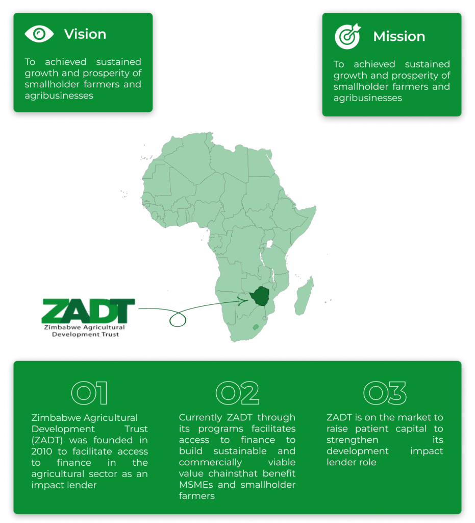 Zimbabwe Agricultural Development Trust (ZADT) has disbursed over 355 loans amounting to $100, 000 000 USD through 8 Commercial Banks and 9 Microfinance Institutions.