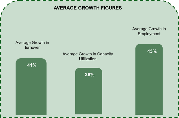 An assessment was done to establish the impact of the ZADT Fund on the performance of funded agribusinesses. The assessment focussed on the extent to which the Fund contributed to changes in three main indicators namely annual turnover, capacity utilization and employment levels. The changes in the parameters were measured between the period when the facility was disbursed and when it matured. The findings are presented in the Figure below.